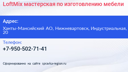 LoftMix, мастерская по изготовлению мебели по адресу Ханты-Мансийский АО, Нижневартовск, Индустриальная, 20 в дальнейшем Организация, размещена в следующих категориях:
