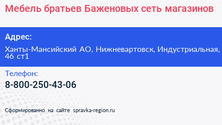 Мебель братьев Баженовых, сеть магазинов по адресу Ханты-Мансийский АО, Нижневартовск, Индустриальная, 46 ст1 в дальнейшем Организация, размещена в следующих категориях: