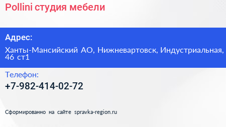Pollini, студия мебели по адресу Ханты-Мансийский АО, Нижневартовск, Индустриальная, 46 ст1 в дальнейшем Организация, размещена в следующих категориях: