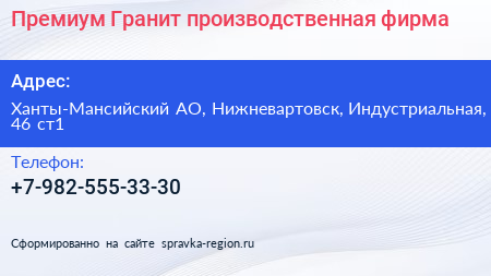 Премиум Гранит, производственная фирма по адресу Ханты-Мансийский АО, Нижневартовск, Индустриальная, 46 ст1 в дальнейшем Организация, размещена в следующих категориях: