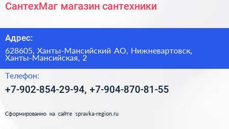 СантехМаг, магазин сантехники по адресу 628605, Ханты-Мансийский АО, Нижневартовск, Ханты-Мансийская, 2 в дальнейшем Организация, размещена в следующих категориях:
