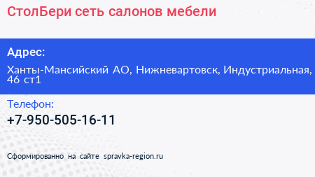 СтолБери, сеть салонов мебели по адресу Ханты-Мансийский АО, Нижневартовск, Индустриальная, 46 ст1 в дальнейшем Организация, размещена в следующих категориях: