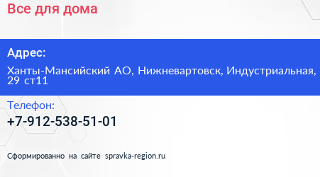 Все для дома по адресу Ханты-Мансийский АО, Нижневартовск, Индустриальная, 29 ст11 в дальнейшем Организация, размещена в следующих категориях: