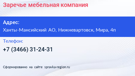 Заречье, мебельная компания по адресу Ханты-Мансийский АО, Нижневартовск, Мира, 4п в дальнейшем Организация, размещена в следующих категориях: