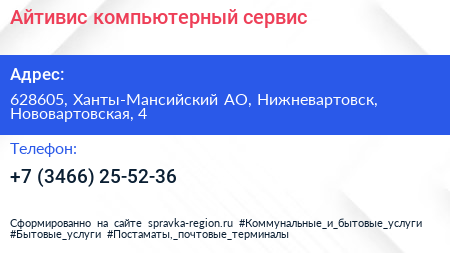 Айтивис, компьютерный сервис по адресу 628605, Ханты-Мансийский АО, Нижневартовск, Нововартовская, 4 в дальнейшем Организация, размещена в следующих категориях: