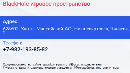 BlackHole, игровое пространство по адресу 628602, Ханты-Мансийский АО, Нижневартовск, Чапаева, 2 в дальнейшем Организация, размещена в следующих категориях: