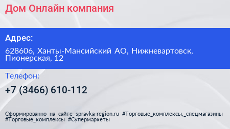 Дом Онлайн, компания по адресу 628606, Ханты-Мансийский АО, Нижневартовск, Пионерская, 12 в дальнейшем Организация, размещена в следующих категориях: