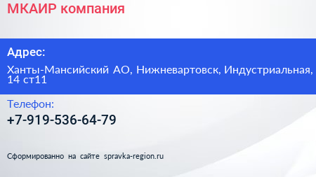 МКАИР, компания по адресу Ханты-Мансийский АО, Нижневартовск, Индустриальная, 14 ст11 в дальнейшем Организация, размещена в следующих категориях: