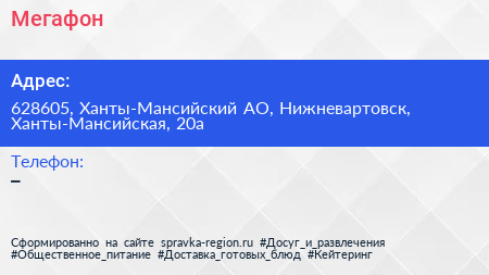 Мегафон по адресу 628605, Ханты-Мансийский АО, Нижневартовск, Ханты-Мансийская, 20а в дальнейшем Организация, размещена в следующих категориях:
