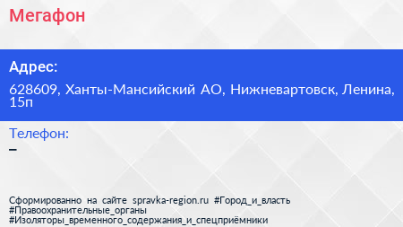 Мегафон по адресу 628609, Ханты-Мансийский АО, Нижневартовск, Ленина, 15п в дальнейшем Организация, размещена в следующих категориях: