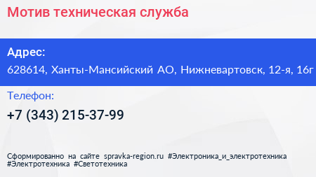 Мотив, техническая служба по адресу 628614, Ханты-Мансийский АО, Нижневартовск, 12-я, 16г в дальнейшем Организация, размещена в следующих категориях: