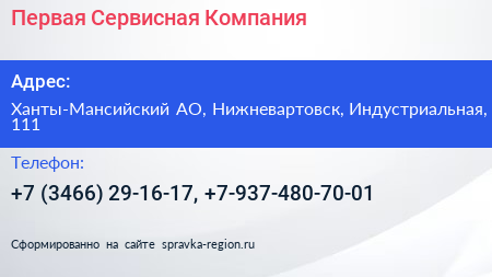 Первая Сервисная Компания по адресу Ханты-Мансийский АО, Нижневартовск, Индустриальная, 111 в дальнейшем Организация, размещена в следующих категориях: