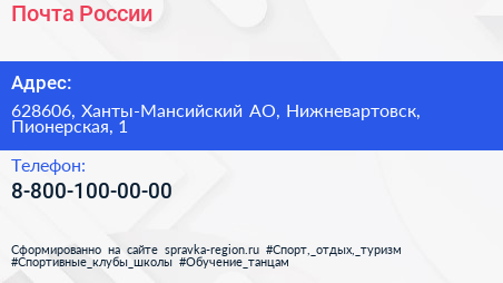 Почта России по адресу 628606, Ханты-Мансийский АО, Нижневартовск, Пионерская, 1 в дальнейшем Организация, размещена в следующих категориях: