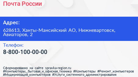 Почта России по адресу 628613, Ханты-Мансийский АО, Нижневартовск, Авиаторов, 2 в дальнейшем Организация, размещена в следующих категориях: