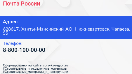 Почта России по адресу 628617, Ханты-Мансийский АО, Нижневартовск, Чапаева, 55 в дальнейшем Организация, размещена в следующих категориях: