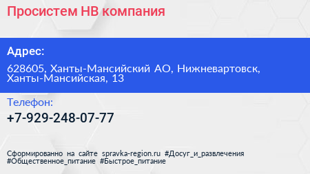 Просистем-НВ, компания по адресу 628605, Ханты-Мансийский АО, Нижневартовск, Ханты-Мансийская, 13 в дальнейшем Организация, размещена в следующих категориях: