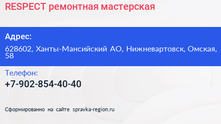 RESPECT, ремонтная мастерская по адресу 628602, Ханты-Мансийский АО, Нижневартовск, Омская, 58 в дальнейшем Организация, размещена в следующих категориях: