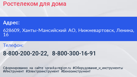 Ростелеком для дома по адресу 628609, Ханты-Мансийский АО, Нижневартовск, Ленина, 16 в дальнейшем Организация, размещена в следующих категориях: