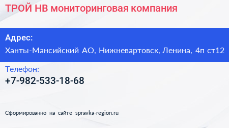 ТРОЙ НВ, мониторинговая компания по адресу Ханты-Мансийский АО, Нижневартовск, Ленина, 4п ст12 в дальнейшем Организация, размещена в следующих категориях: