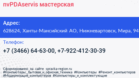 nvPDAservis, мастерская по адресу 628624, Ханты-Мансийский АО, Нижневартовск, Мира, 94 в дальнейшем Организация, размещена в следующих категориях: