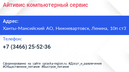 Айтивис, компьютерный сервис по адресу Ханты-Мансийский АО, Нижневартовск, Ленина, 10п ст3 в дальнейшем Организация, размещена в следующих категориях: