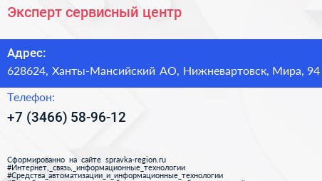 Эксперт, сервисный центр по адресу 628624, Ханты-Мансийский АО, Нижневартовск, Мира, 94 в дальнейшем Организация, размещена в следующих категориях: