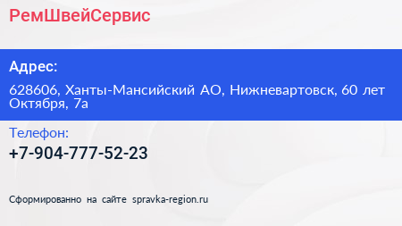 РемШвейСервис по адресу 628606, Ханты-Мансийский АО, Нижневартовск, 60 лет Октября, 7а в дальнейшем Организация, размещена в следующих категориях:
