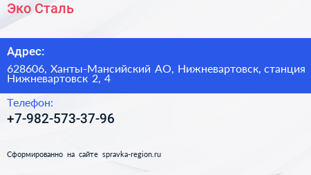 Эко-Сталь по адресу 628606, Ханты-Мансийский АО, Нижневартовск, станция Нижневартовск 2, 4 в дальнейшем Организация, размещена в следующих категориях: