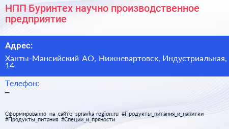 НПП Буринтех, научно-производственное предприятие по адресу Ханты-Мансийский АО, Нижневартовск, Индустриальная, 14 в дальнейшем Организация, размещена в следующих категориях: