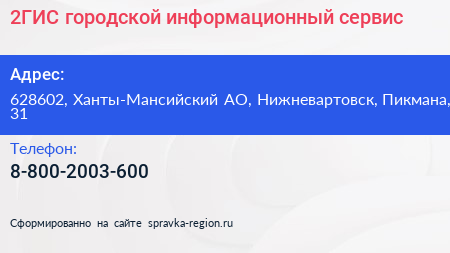 2ГИС, городской информационный сервис по адресу 628602, Ханты-Мансийский АО, Нижневартовск, Пикмана, 31 в дальнейшем Организация, размещена в следующих категориях: