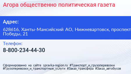 Агора, общественно-политическая газета по адресу 628616, Ханты-Мансийский АО, Нижневартовск, проспект Победы, 21 в дальнейшем Организация, размещена в следующих категориях: