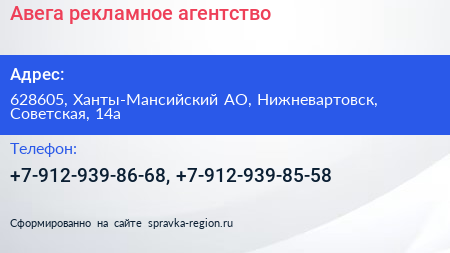 Авега, рекламное агентство по адресу 628605, Ханты-Мансийский АО, Нижневартовск, Советская, 14а в дальнейшем Организация, размещена в следующих категориях: