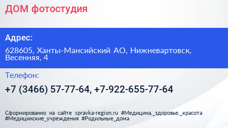ДОМ, фотостудия по адресу 628605, Ханты-Мансийский АО, Нижневартовск, Весенняя, 4 в дальнейшем Организация, размещена в следующих категориях: