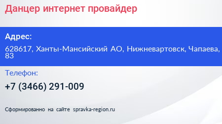 Данцер, интернет-провайдер по адресу 628617, Ханты-Мансийский АО, Нижневартовск, Чапаева, 83 в дальнейшем Организация, размещена в следующих категориях: