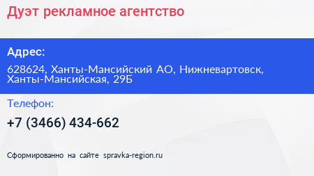Дуэт, рекламное агентство по адресу 628624, Ханты-Мансийский АО, Нижневартовск, Ханты-Мансийская, 29Б в дальнейшем Организация, размещена в следующих категориях: