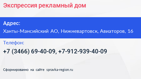 Экспрессия, рекламный дом по адресу Ханты-Мансийский АО, Нижневартовск, Авиаторов, 16 в дальнейшем Организация, размещена в следующих категориях:
