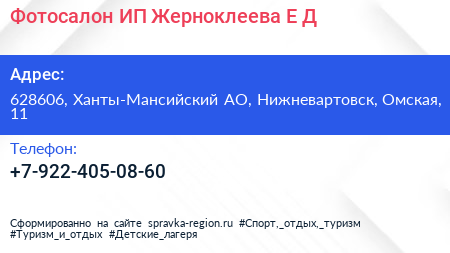 Фотосалон, ИП Жерноклеева Е.Д. по адресу 628606, Ханты-Мансийский АО, Нижневартовск, Омская, 11 в дальнейшем Организация, размещена в следующих категориях:
