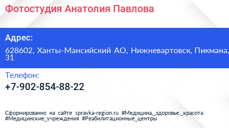 Фотостудия Анатолия Павлова по адресу 628602, Ханты-Мансийский АО, Нижневартовск, Пикмана, 31 в дальнейшем Организация, размещена в следующих категориях: