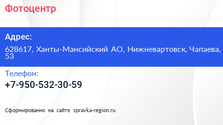 Фотоцентр по адресу 628617, Ханты-Мансийский АО, Нижневартовск, Чапаева, 53 в дальнейшем Организация, размещена в следующих категориях: