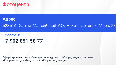 Фотоцентр по адресу 628616, Ханты-Мансийский АО, Нижневартовск, Мира, 23 в дальнейшем Организация, размещена в следующих категориях: