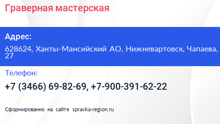 Граверная мастерская по адресу 628624, Ханты-Мансийский АО, Нижневартовск, Чапаева, 27 в дальнейшем Организация, размещена в следующих категориях: