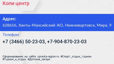 Копи-центр по адресу 628616, Ханты-Мансийский АО, Нижневартовск, Мира, 9 в дальнейшем Организация, размещена в следующих категориях: