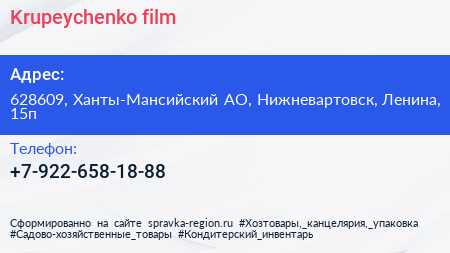 Krupeychenko film по адресу 628609, Ханты-Мансийский АО, Нижневартовск, Ленина, 15п в дальнейшем Организация, размещена в следующих категориях: