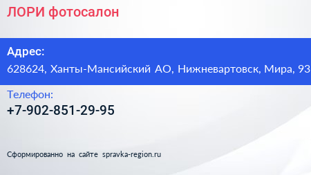 ЛОРИ, фотосалон по адресу 628624, Ханты-Мансийский АО, Нижневартовск, Мира, 93 в дальнейшем Организация, размещена в следующих категориях: