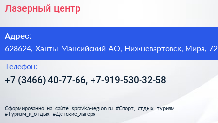 Лазерный центр по адресу 628624, Ханты-Мансийский АО, Нижневартовск, Мира, 72 в дальнейшем Организация, размещена в следующих категориях: