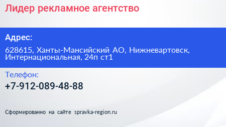 Лидер, рекламное агентство по адресу 628615, Ханты-Мансийский АО, Нижневартовск, Интернациональная, 24п ст1 в дальнейшем Организация, размещена в следующих категориях:
