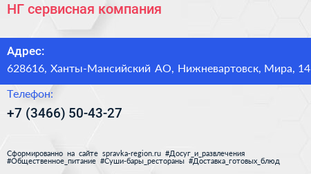 НГ, сервисная компания по адресу 628616, Ханты-Мансийский АО, Нижневартовск, Мира, 14 в дальнейшем Организация, размещена в следующих категориях: