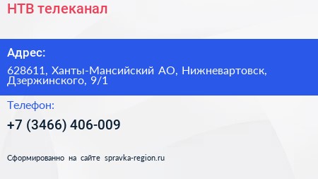 НТВ, телеканал по адресу 628611, Ханты-Мансийский АО, Нижневартовск, Дзержинского, 9/1 в дальнейшем Организация, размещена в следующих категориях: