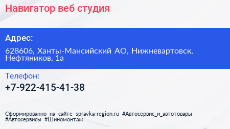 Навигатор, веб-студия по адресу 628606, Ханты-Мансийский АО, Нижневартовск, Нефтяников, 1а в дальнейшем Организация, размещена в следующих категориях: