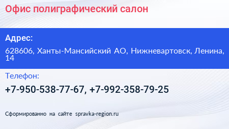 Офис, полиграфический салон по адресу 628606, Ханты-Мансийский АО, Нижневартовск, Ленина, 14 в дальнейшем Организация, размещена в следующих категориях: